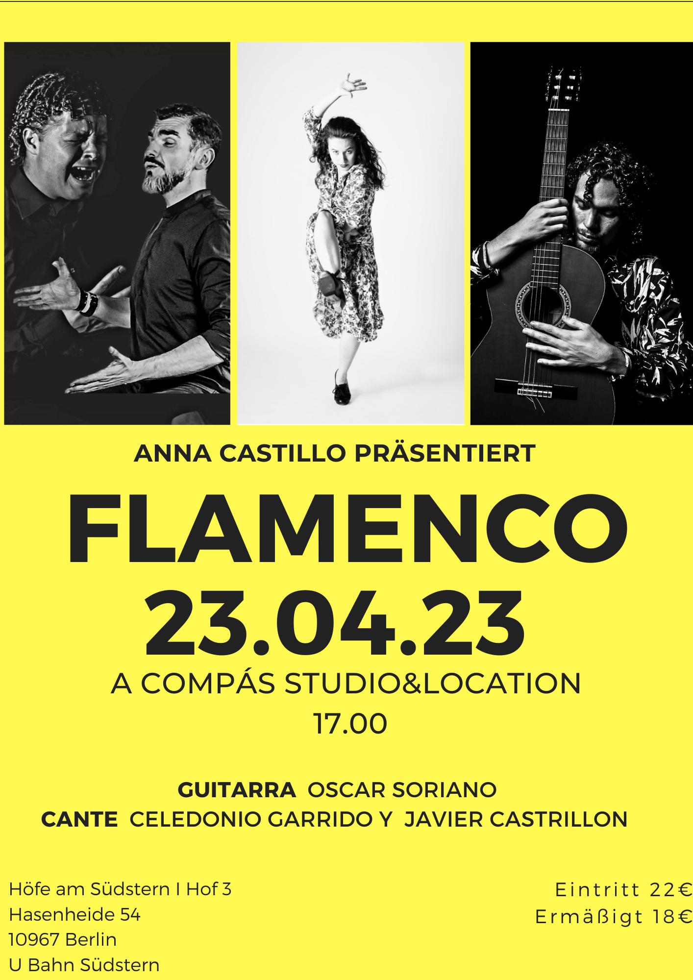 Tablao Flamenco 23.04.23 im a compás Tanz: Anna Castillo Gesang: Celedonio Garrido, Javier Castrillón Gitarre: Oscar Sorriano Nicht verpassen! Einlass 16:00 Beginn 17:00 Eintritt 22€/ erm. 18€ Reservierung: info@acompas.de (Begrenzte Plätze)