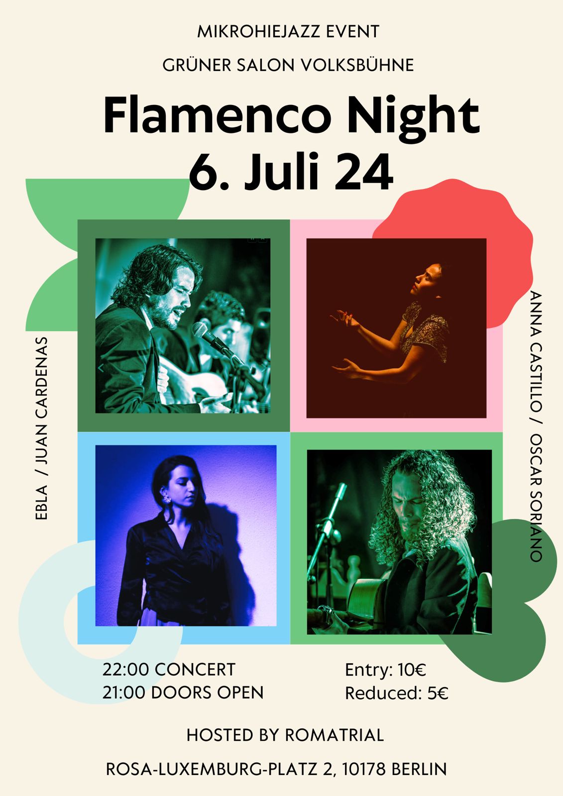 MIKROHIEJAZZ EVENT presents Flamenco Night 6. Juli 2024 Grüner Salon Volksbühne Voc.: Ebla /Juan Cardenas Guitar: Oscar Soriano Dance: Anna Castillo 22:00 concert 21:00 Doors open Hosted by Romatrial