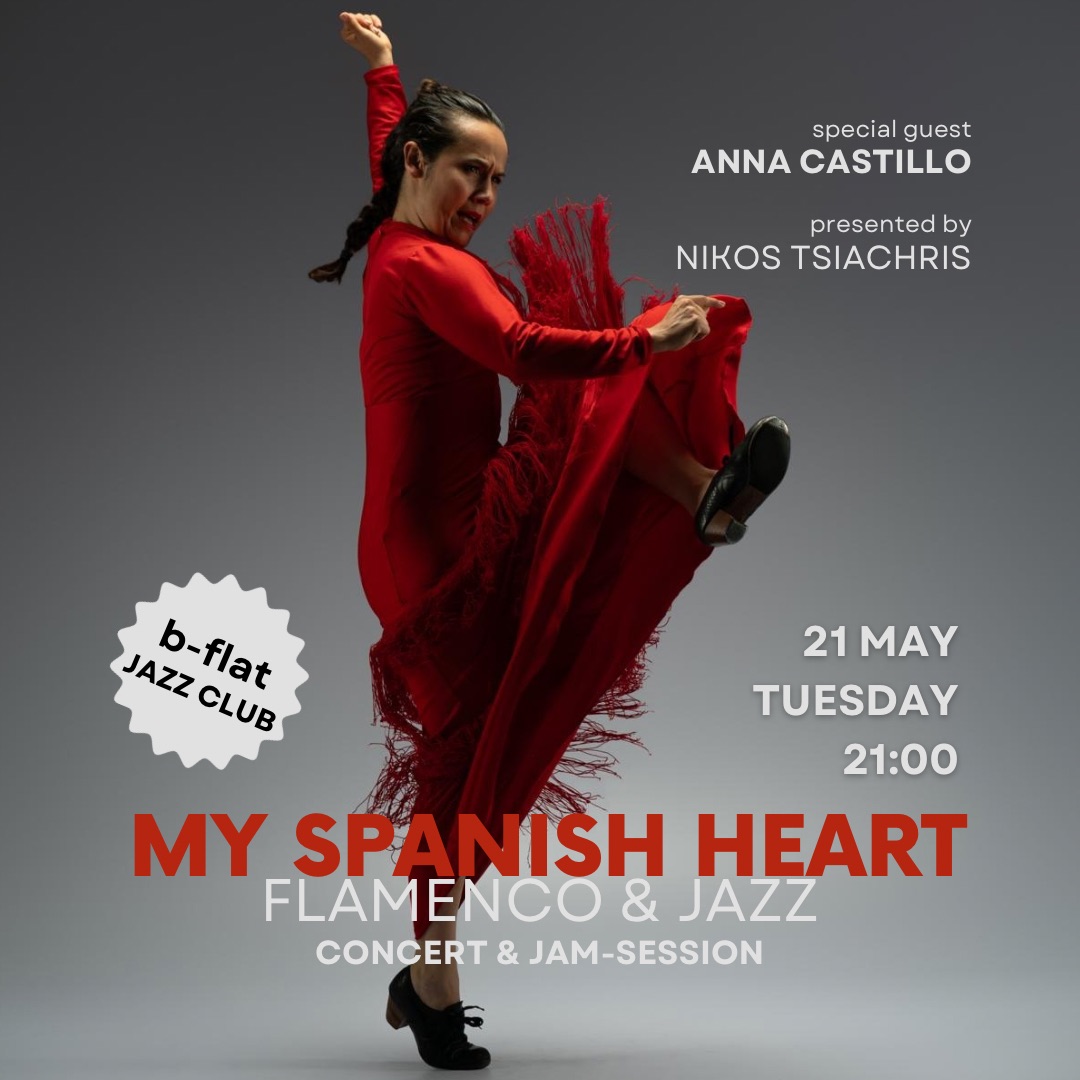 Nikos Tsiachris & b-flat jazz club present MY SPANISH HEART # 03 FLAMENCO & JAZZ | CONCERT & JAM-SESSION Doors open: 20:00 – Concert: 21:00 Special Guests: Anna Castillo (dance), Javi Castrillón (vocal) Nikos Tsiachris (guitar), Naoufal Montassere (guitar), Jonatan Morgenstern (piano) Regis Molina (saxophone/flute), Cristian Betancourt (percussion) Flamenco und Jazz sind Bruder im Geiste. […]